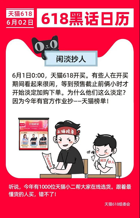 在网上看到这个简直笑到我了感觉自己不是冲浪人,这个618都白过了..... 今年的 618 又有哪些黑话?一起来看看这些梗你造吗??01闲淡抄人 往年蹲点买买买的网友,今年戏称自己是“闲淡抄人”,等到预售截止前俩小时才开始淡定加购下单。反正今年有官方作业可以抄。