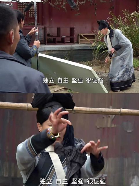 当说到如懿的性格是独立 自主 坚强 很倔强的时候,剪辑师配的是她在冷宫提水,留着长指甲,炸着手晾衣服的镜头
