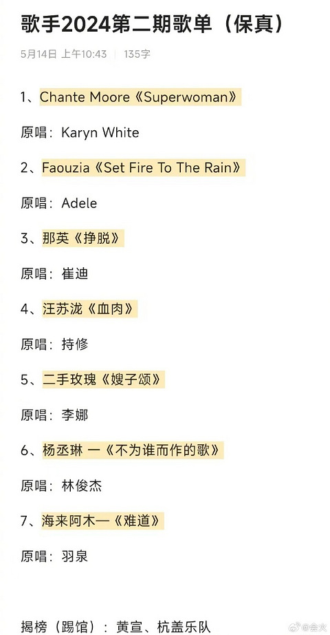 1、Chante Moore《Superwoman》 原唱:Karyn White 2、Faouzia《Set Fire To The Rain》 原唱:Adele 3、那英《挣脱》 原唱:崔迪 4、汪苏泷《血肉》 原唱:持修 5、二手玫瑰《嫂子颂》 原唱:李娜 6、杨丞琳 《不为谁而作的歌》 原唱:林俊杰 7、海来阿木《难道》 原唱:羽泉 揭榜:黄宣、杭盖乐队
