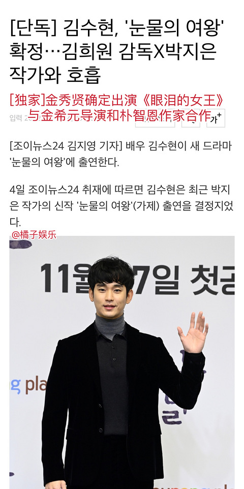 金秀贤确定出演朴智恩新作《眼泪的女王》