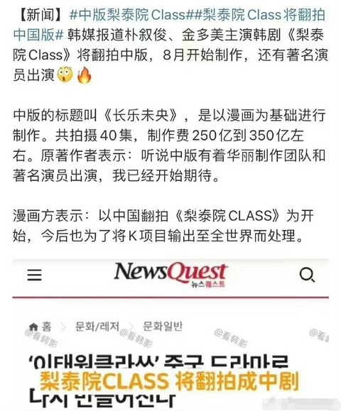 据韩媒,《梨泰院class》将翻排拍中国版,改名为《长乐未央》没必要,也拍不好,真的别拍
