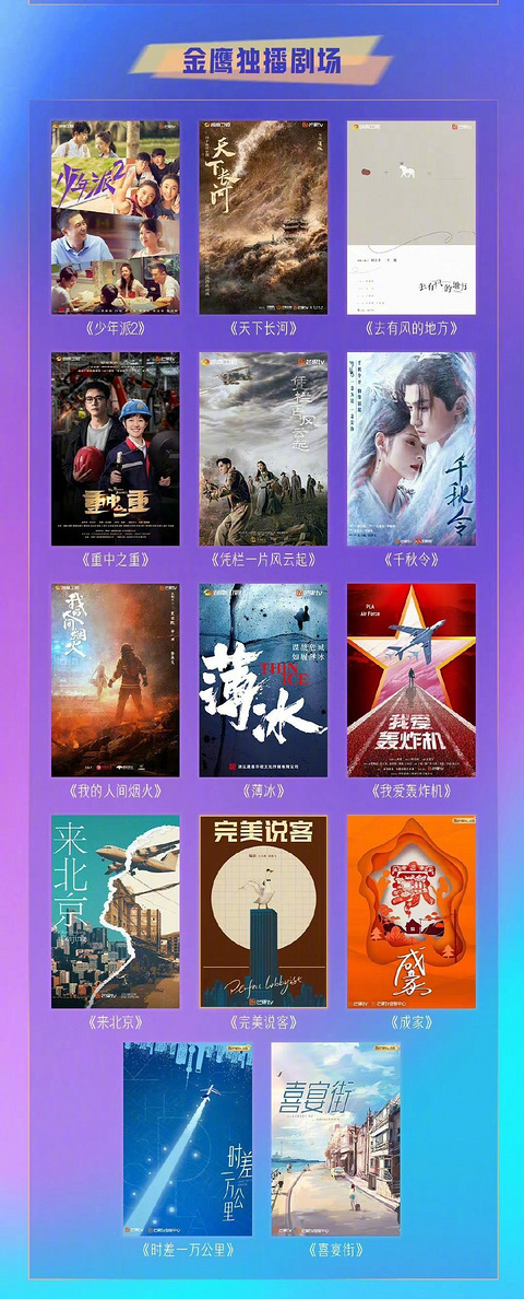 湖南卫视金鹰剧场: 刘亦菲/李现《去有风的地方》、杨洋/王楚然《我的人间烟火》、彭冠英/陈钰琪《薄冰》、张予曦/佟梦实《千秋令》、罗晋/尹昉/黄志忠《天下长河》、张嘉益/闫妮/赵今麦《少年派2》 《重中之重》《我爱轰炸机》《来北京》《成家》《完美说客》《凭栏一片风云起》《成家》 《时差一万公里》《喜宴街》