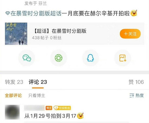 网传《在暴雪时分》一月底在赫尔辛基(芬兰)开拍