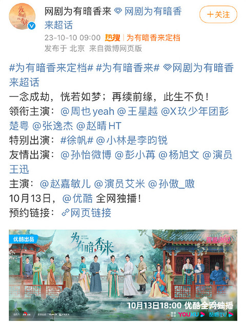 周也、王星越主演的新剧《为有暗香来》定档10.13