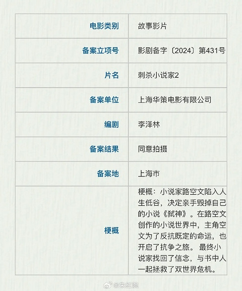 路阳执导电影《刺杀小说家2》 主演:雷佳音、邓超、董子健、辛芷蕾、丁程鑫 7月重庆、青岛开机,拍摄周期100天。 简介:小说家路空文陷入人生低谷,决定亲手毁掉自己的小说《弑神》。在路空文创作的小说世界中,主角空文为了反抗既定的命运,也开启了抗争之旅。 最终小说家找回了信念,与书中人一起拯救了双世界危机