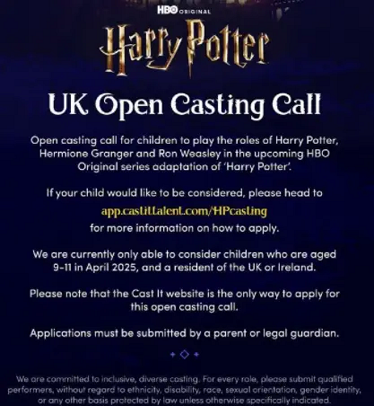 开始选拔演员,公开招募出演哈利·波特、赫敏·格兰杰、罗恩·韦斯莱的小朋友,确定明年4月开拍。HBO要求报名的小演员在明年4月时年龄为9-11周岁,且为英国或爱尔兰居民