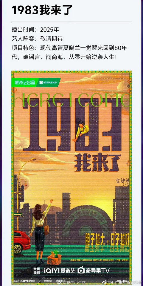 电视剧《1983我来了》 改编自原著宝妆成的《重生八零:媳妇有点辣》 主演:周也、翟潇闻