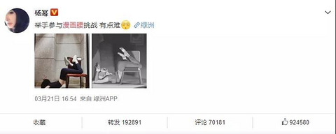 杨幂又翻车了。 这事还得从昨天说起。 她模仿漫画人物的姿势,用椅子下腰,谓之「漫画腰挑战」。 虽然体态扭曲,毫无美感,但在粉丝一顿猛夸之下,该条微博点赞近百万。