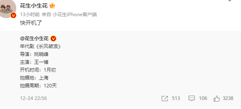 年代剧《长风破浪》 导演:姚晓峰 主演:王一博 开机时间:1月初 拍摄地:上海 拍摄周期:120天