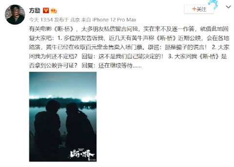 电影《断桥》制片人方励发博辟谣电影近期公映。据悉,电影《断桥》由李玉执导,王俊凯、马思纯、范伟主演。有关电影《断·桥》为何还不定档,方励回复:“这不是我们自己能决定的” ,同时他表示还在继续等待《断桥》的公映许可证