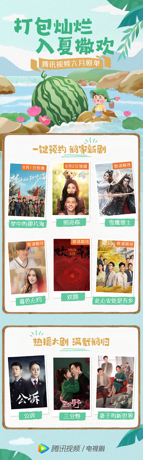 肖战、李沁《梦中的那片海》(今晚开播) 陈伟霆、章若楠《照亮你》(6.2开播) 许凯、娜扎《雪鹰领主》 任嘉伦、杨颖《暮色心约》 董子健、张译《欢颜》 任重、安悦溪《此心安处是吾乡》 热播中:《公诉》《三分野》《妻子的新世界》