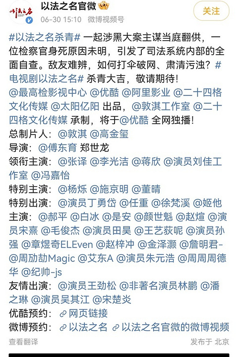 一起涉黑大案主谋当庭翻供,一位检察官身死原因未明,引发了司法系统内部的全面自查。敌友难辨,如何打伞破网、肃清污浊?电视剧《以法之名》 杀青大吉,敬请期待!