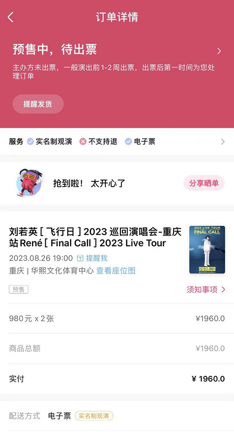 抢了两张刘若英26号演唱会的票,980的连坐,看有需要的没得