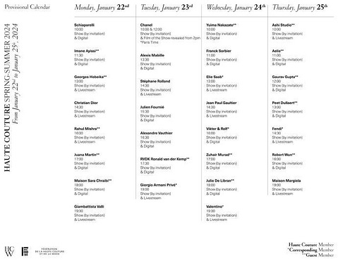 巴黎高级定制和时尚联合会 FHCM 发布全新 2024 年春夏高定时装周官方日程 ,此次高定周定于 1 月 22 日 — 1 月 25 日举办 ,预计将有约 30 个品牌在期间发布新一季高定作品 ; 本季的官方会员名单相比上一季变化甚少 ,无任何品牌退出会员名单的同时新增了来自于荷兰的设计师品牌 Peet Dullaert ,将以客座会员身份带来高定首秀 ;而这一季值得期待的部分自然包括阔别一季回