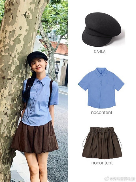 上海街拍镜头下的章若楠,蓝色衬衫+咖色花苞短裤,很有风格的一套,可爱又青春