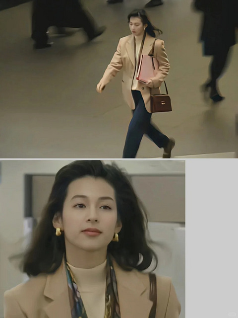 东爱首播是91年,正是日本泡沫经济尾声, 莉香的角色设定是海归,在一家广告公司工作, 我边看就边感慨: 莉香和她同事三十多年前的穿搭, 放到现在看都很时髦又实穿!不少搭配都可以轻松照搬。截图来看一看! 基础色:卡其西装+米色内搭+深藏青锥形裤 提亮色:印花丝巾 + 复古金色耳饰 + 棕色背包 这套配色真的太经典了! 整体低调温柔有质感,丝巾和大耳饰提亮和提升气场, 云淡风清又不好惹的感觉