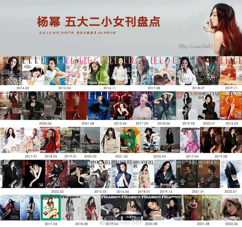 五大:Vogue ,ELLE,嘉人,时尚芭莎,时尚COSMO二小:时尚L'officiel,费加罗(以上杂志衍生刊以及电子刊不在统计范围) 幂:五大二小35刊57封