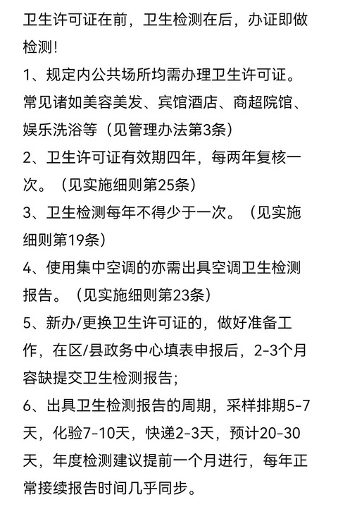 #重庆公共场所卫生检测(报告)第三方检测机构专业CMA资质#重庆卫生许可证办理注意事项重庆从事公共场所卫生检测的大叔。服务过程经常有人咨询卫生许可证事宜。结合国/地政策、政务中心例表,梳理对照。业务溯源:新开/失效换证,先去各区/县申报卫生许可证,卫生检测报告可3月内后置完善;卫生许可证效期4年,卫生检测报告效期1年!关注报告封面时间,月份提前半个月着手下一年的卫生检测是比较合适的!(卫生检测报告