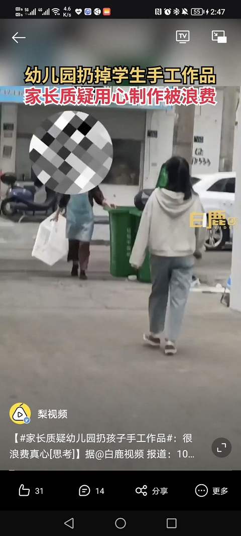 据@白鹿视频 报道:10月8日,浙江温州。王女士送孩子上幼儿园,看到幼儿园阿婆抱了1箱手工作品扔进垃圾桶,觉得十分可惜。 王女士介绍,部分作品看着做得很用心很精致但也被扔掉了,一般幼儿作品都是家长和孩子一起用心做的,这样扔掉很浪费真心。如果可以让孩子们带回去,家长自己处置或许更妥当。