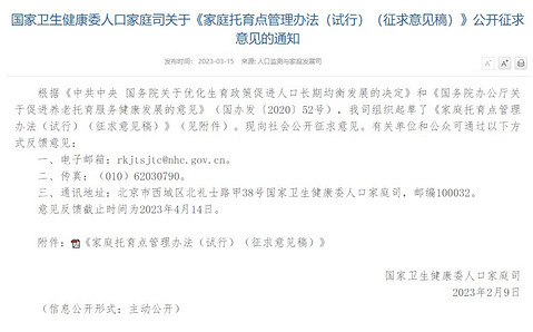 3月15日,据国家卫健委网站消息《家庭托育点管理办法(试行)(征求意见稿)》公开征求意见。