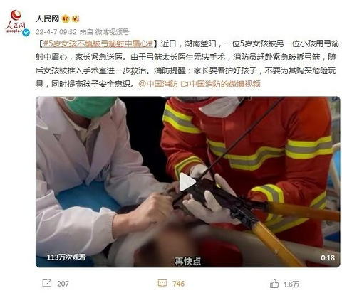 近日,湖南益阳,一位5岁女孩被另一位小孩用弓箭射中眉心,家长紧急送医。 由于弓箭太长医生无法手术,消防员赶赴紧急破拆弓箭,随后女孩被推入手术室进一步救治。 消防提醒:家长要看护好孩子,不要为其购买危险玩具,同时提高孩子安全意识。