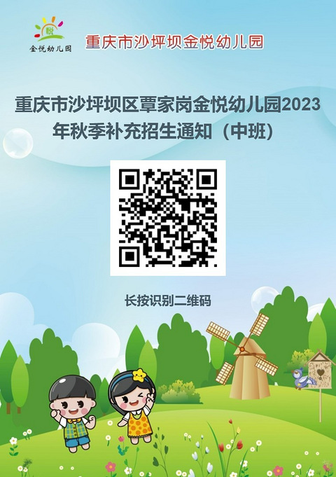 重庆市沙坪坝区金悦幼儿园是一所隶属于沙区教委的公办一级普惠幼儿园。现将2023秋季面向社会补充招生的通知公布如下: 一、补招班级2023年秋季中班、大班 二、补招年龄中班2018年9月1日--2019年8月31日期间出生 大班2017年9月1日--2018年8月31日期间出生 三、补招名额中班补招13人大班补招7人 四、学位申请方式本次招生将以网上申请学位的方式,即日起可扫描二维码登记幼