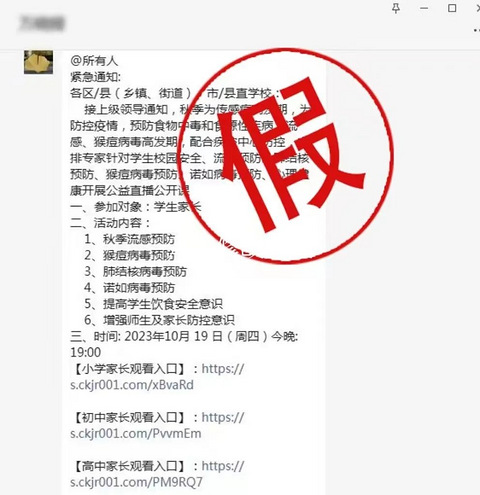 近日,沙坪坝区部分学校教职工收到一则“沙坪坝区开展‘传染病高发期学生校园安全、流感预防、肺结核预防、猴痘病毒预防、诺如病毒预防、心理健康公益直播公开课’”的消息。该消息称沙坪坝区疾控中心将安排专家于10月19日晚线上免费开展该“公益直播公开课”,并附上观看入口的链接。经核实,我中心无相关人员发出过上述通知此消息是假的!假的!假的!