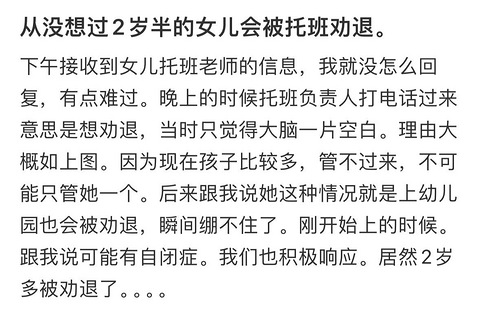 微博热搜,有妈妈说自己两岁半的女儿被托班劝退 去幼儿园本来就是要融入集体生活的,听不懂指令讲也不听,老师又不能训,自己孩子一个就折腾的要命别难为老师了,而且自己的孩子还是自己多用心不要托给老师,我看有的上小学的自闭症孩子学校是让家长陪同的,去幼儿园家长也去陪同一下吧,你自己都搞不定老师怎么搞 ???[/11拜拜]