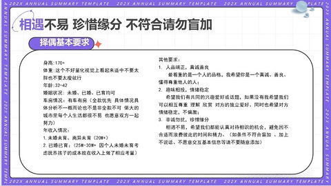 如有意向,请把彼此真实的基本信息和要求全部了解清楚,避免因模棱两可、弯弯绕绕、东猜西疑、藏着掖着而浪费彼此的时间。若打算继续交往,可以相互核实身份证、工作、婚姻、渝快办信息、个人纳税申报等信息的真实性,以结婚为目的,不备胎、不海王、不盲加、不海聊! 性别:女身高:159体重:108年龄:33工作:物流相关行业婚姻状况:否居住地址:现居大学城 工作也在大学城自我介绍:三观端正 乐观上进 性格属于偏外