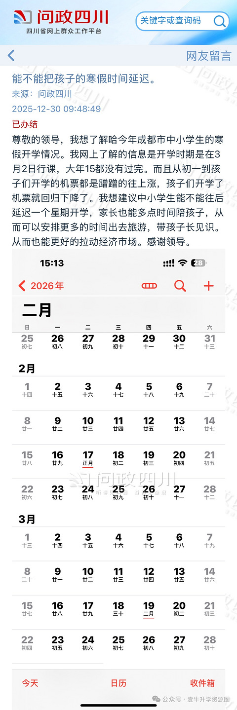 真的,请写建议的家长不要建议了。四川还有春秋假,下学期3月上学6月放学,学习的时间本来就很短了,还想着要耍大年,等机票便宜了带娃出去耍这种家庭就不要在公办体系读书了嘛,去国际学校,一年有半年都在耍,满足你各种错峰出游的需求[/11吃瓜] 近日,又有成都家长在“问政四川”平台上留言,建议中小学生往后延迟一个星期开学。该网友表示,目前信息显示开学时间为3月2日,大年15都没有过完,机票价格也因开学临近