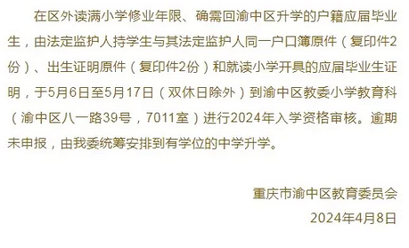 家长们,近期是否都关注到了渝中区教委发布的通知呢?4月8日,渝中区教育委员会发布以下通知,区外户籍应届毕业生可以准备2024年rxzg审核了!渝中区户籍六年级学生家长需要重点关注。 2024年渝中小升初 / 在区外读满小学修业年限、确需回渝中区升学的户籍应届毕业生,由法定监护人持学生与其法定监护人同一户口簿原件(复印件2份)、出生证明原件(复印件2份)和就读小学开具的应届毕业生证明,于5月6日至