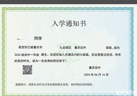 2024年重庆幼升小、小升初摇号战役正式打响了! 昨天,九龙坡区已完成2024年民转公校摇号工作。在我们的升学群里,有家长报喜,摇中心仪学校-重庆实外国语学校,领到了电子版录取通知书!恭喜家长!
