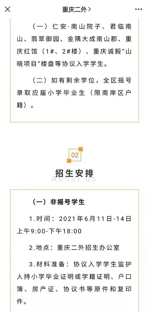 2021年南岸区 融侨南开、二外、11中文德,招生范围: 1、楼盘协议入学:旧人旧办法,新人新办法,应该只针对前期有购房就读协议的业主,新购买不会有入学协议。 2、对口直升小学:融创南坪实验小学、 融侨人民小学。这两所小学随后可能要出台入学配套政策,避免小学装不下。比如购买年限、入住年限、抽签派位、多校划片等等。 3、剩余名额:全区摇号。摇中就上,摇不中 由区教委统筹分配。