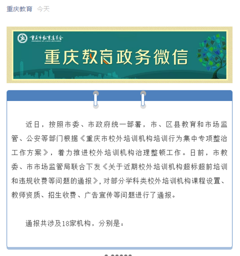 一、重庆学而思有关校区:部分课程超标超前培训;对新学员提前超期违规收费;利用学员入读名校进行宣传,涉嫌虚假宣传、虚假广告等违法行为。二、思玛德教育:部分区县教学点涉嫌无证无照非法办学;涉嫌虚假宣传、虚假广告等违法行为;超期违规收费;超标超前培训。三、重庆市渝中区学翰课外培训中心有限公司:涉嫌虚假宣传等违法行为;实际经营地址与登记地址不一致。四、重庆市渝中区码峰窝课外培训学校有限公司:微信公众号宣传