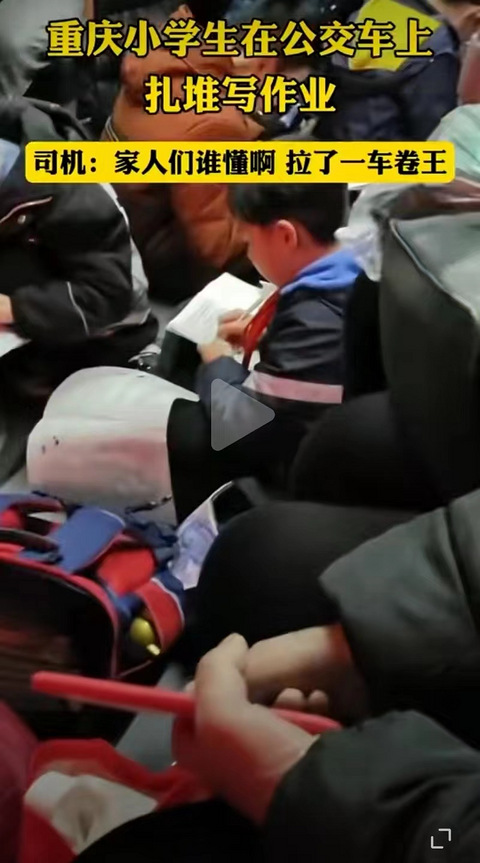 近日,在重庆某公交车上,一车的孩子挤满公交车坐在各个角落写作业,真的太拼了。网友:这比各地文旅比拼都还卷!评论区纷纷表示,现在的孩子太拼了,压力太大!