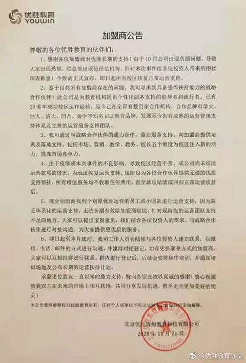 11月21日,优胜教育创始人陈昊在其个人微博发布一封针对加盟商的公告。 陈昊在公告中称即日起(11月21日)所有校区恢复正常运营支持。鉴于目前加盟校区存在的经营问题,陈昊称优胜教育目前在寻求具备强悍扶持能力的战略合作伙伴。此外,优胜教育还将与该战略合作伙伴合作,重启对加盟商的服务支持,向加盟商提供培训及落地支持,包括市场、营销、教学、教务、校长五个维度。 陈昊强调现阶段为所有加盟商都将提供无偿的优