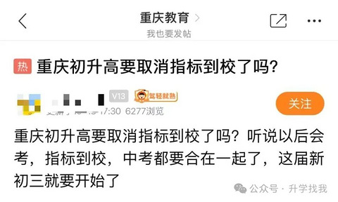 在竞争白热化的中考赛道上,指标到校无疑是普通学生实现升学目标的超高性价比路径。 然而,近日一则传言甚嚣尘上:重庆或将取消指标到校政策,未来毕业会考、指标到校、中考三考合一。 此消息一出,瞬间引发广泛关注。 有网友分析,三考合一或许只是将中考成绩纳入指标到校的参考体系,且联招录取与指标到校录取并不冲突。 至于实际情况究竟如何,我们不妨静候官方消息。 说到这,明年即将参加中考的家长们是不是又挠头了,“