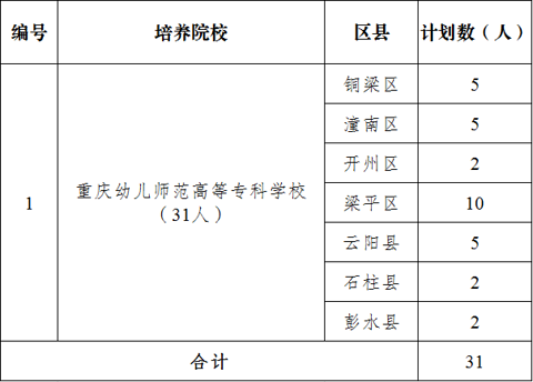 2025年重庆市继续面向全市应届初中毕业生招收学前教育公费师范生,为我市7个区县定向培养幼儿园教师31人,培养学制为5年,学历层次为专科,培养学校为重庆幼儿师范高等专科学校。 重庆市2025年学前教育公费师范生定向培养招生计划表 温馨提示:定向培养的7个区县是指就业区县,市内所有区县符合报考条件的应届初中毕业生均可报考。