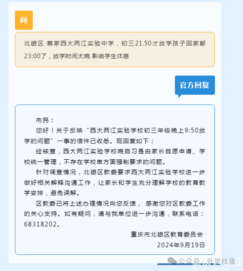 近日,有网友在网上发文表示,西大两江实验学校初三学生21点50放学,到家都23点了,家长认为放学时间太晚影响学生休息。 9月19日,北碚区教委回复:晚自习是家长自愿申请,学校统一管理,不存在学校单方面的要求。 晚上21点50下放学,回家23点,这其中的原因,我们就不去深扒了。只想说说重庆中学生们的生活,现在是真不容易,一天的作息时间表排下来,连好多成人都是要大呼“恐怖”的地步 西瓜整理了重庆多所热