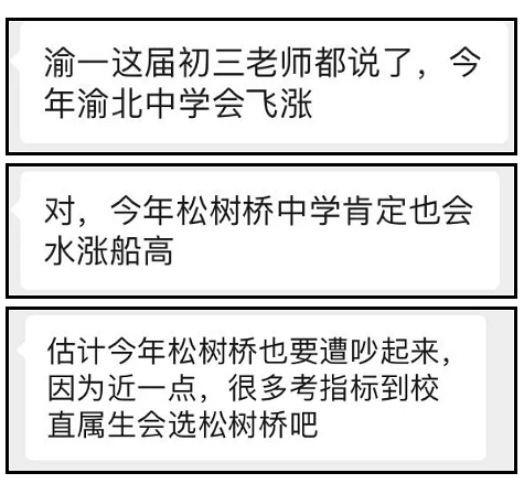 前段时间,重庆主城各区都先后进行了指标到校考试。 截止到现在,九龙坡区、沙坪坝区、高新区,可以查成绩了。 而录取分数线当然也是大家关注的重点。 有家长爆料:今年,渝北中学、松树桥中学的指标到校分数线可能飞起涨。