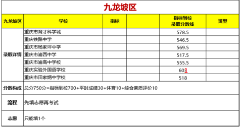 据悉,2025年九龙坡区初中毕业人数为12263人,而2024年中考人数为12525人,相较之下,今年减少了近300人。 2025年九龙坡区指标到校考试时间为4月23日-24日。2025年九龙坡区指标到校志愿填报时间:4月12-14日(坡区是先填志愿再考试,而且只有一个志愿) 2024年坡区指标到校分数构成发生了细微变化,往年的50分综合素质评价改为:平时成绩30+体育10+综评10,具体为: 九