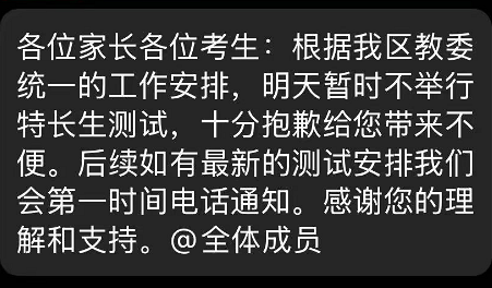 什么情况,现在连初升高的艺体都会受限吗?目前听到说周末要取消特长生测试的学校有:渝北八中,两江南开,渝北中学,松树桥中学,华蓥中学,南华中学