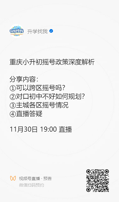 平时工作经常有很多家长问管管: 重庆小升初摇号流程是怎样的?上岸后,还要去摇号吗?是否可以跨区摇号?摇号未中能否读对口学校? 11月30日19:00西瓜给大家直播分享《重庆小升初摇号政策深度解析》帮助大家了解重庆小升初摇号最新信息减少升学信息差 直接扫码预约直播