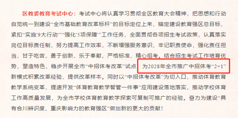 重磅消息!自初 2028 级(即今年 9 月新入学的初一学生)起,中招体育考试将采用“2 + 1”全新考试模式:2 项必考,每项 15 分;1 项选考,20 分,总计 50 分。 2项必考为:立定跳远和一分钟跳绳,各15分;相较于现在的中考体育项目减少了实心球。1项选考:篮球、足球、排球、羽毛球、乒乓球、网球、100米游泳、武术“八选一”,20分。 此次中考体育改革,告别了传统的三项考试模式,采