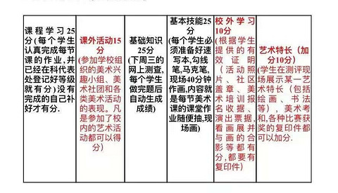 看到一位初中家长分享的,全年级参加重庆美术测查评分标准为以下几个项目课程学习25分美术素养上机考25分课外活动15分(参加美术活动、社团、艺术节等艺术活动)基本技能25分(课堂作业里抽,现场作画)校外学习10分(报班、看展等)艺术特长10分(美术考试、比赛名次等)总分100分!这样不光是看学校学习了,也要看参加活动、获奖等,感觉还是有点费钱哦,看看你们孩子美术能得多少分?