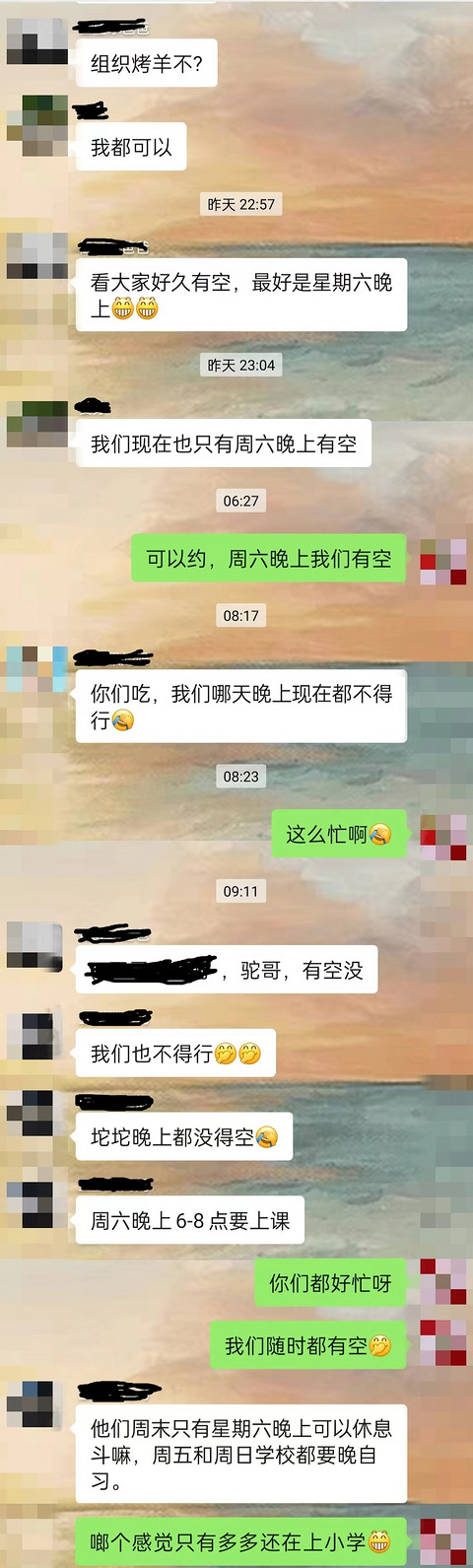 初三了,从小耍到大的五个小伙伴(小学一个班的),以前每周都在聚,上了初中后两个在区重2+4班,2个在西附,我家这个在区重的普通班。聚会的时间就已经寥寥无几了,现在是一学期就聚这么一两次都难,唉,普娃的空闲时间只能自己打发了。