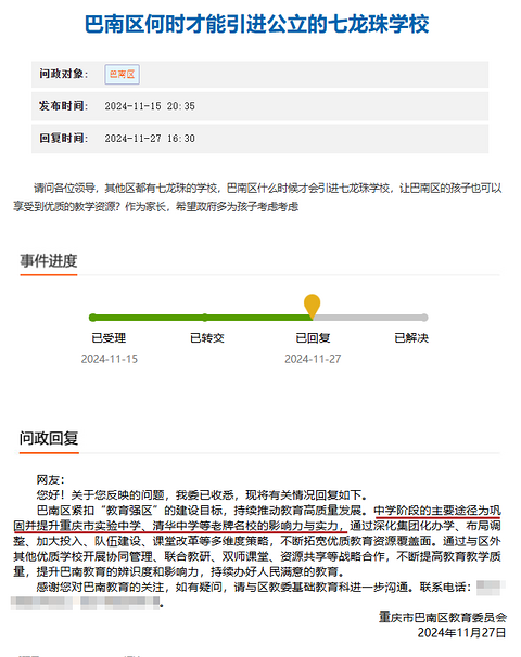 近年来,有关“锁区”的传言愈演愈烈,这使得不少家长愈发关注起所在区域的教育资源配置。纵观主城各区中学教育资源,可以发现,目前唯独巴南区尚未拥有公办的龙珠学校。 针对这一现状,近日,有网友在重庆网络问政平台提问,“巴南区何时才能引进公立的七龙珠学校”。 11月27日,巴南区教委回复道,“···中学阶段的主要途径为巩固并提升重庆市实验中学、清华中学等老牌名校的影响力与实力”。