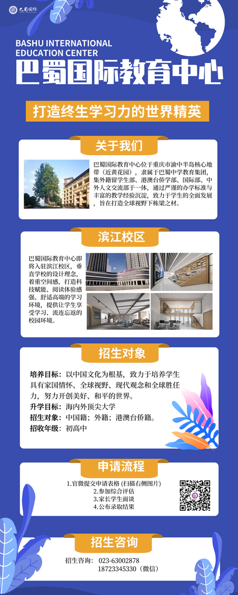 巴蜀教育中心—滨江校区开始招生了,招收初高中