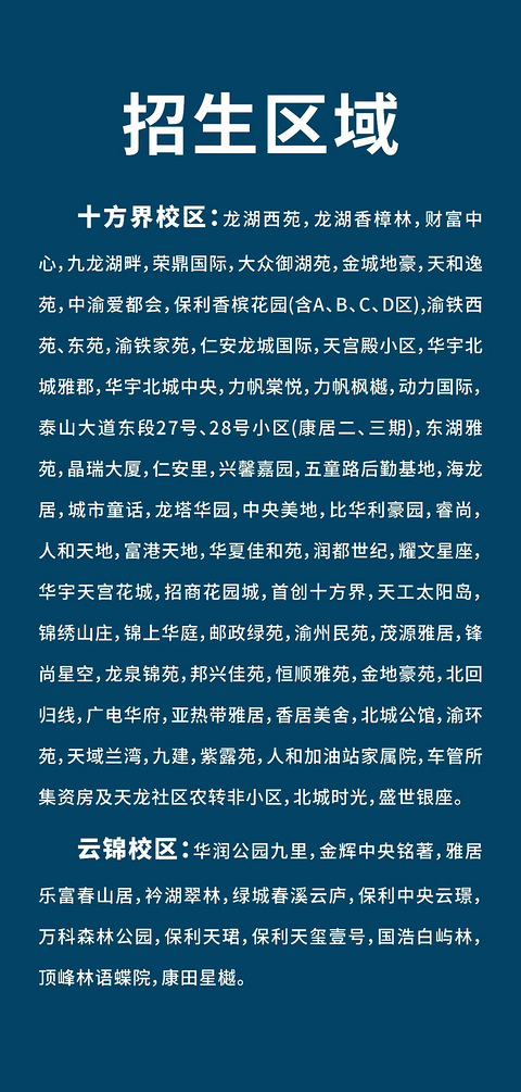 四川外国语大学附中两江中学校(简称“两江川外附中”)是由重庆市两江新区管委会与四川外国语大学携手共建的优质公办完全中学。学校十方界校区位于两江新区天宫殿街道红枫路,占地70亩,建筑面积6万平方米;云锦校区位于两江新区翠云街道长岭路(中央公园南),占地100亩,建筑面积9万平方米。 四川外国语大学附中两江中学校云锦中学划片终于公布了,这些楼盘可以读 招生计划十方界校区:14个班,700人云锦校区:4
