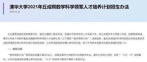 “我正在参加1月学校龙门阵,你也一起来吧https://go.cqmmgo.com/forum-462534-thread-47021609739669039-1-1.html” 近日,清华大学发布丘成桐数学科学领军人才培养计划(简称“数学领军计划”),面向全球招收初中生和高中生。据悉,这是清华大学今年新推出的一项人才培养计划。 清华大学原本就有“丘成桐数学英才班”,主要招收有数学潜质和特长的普通